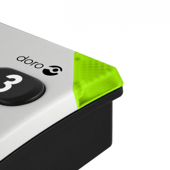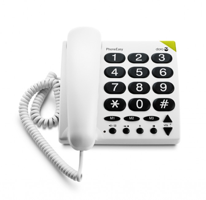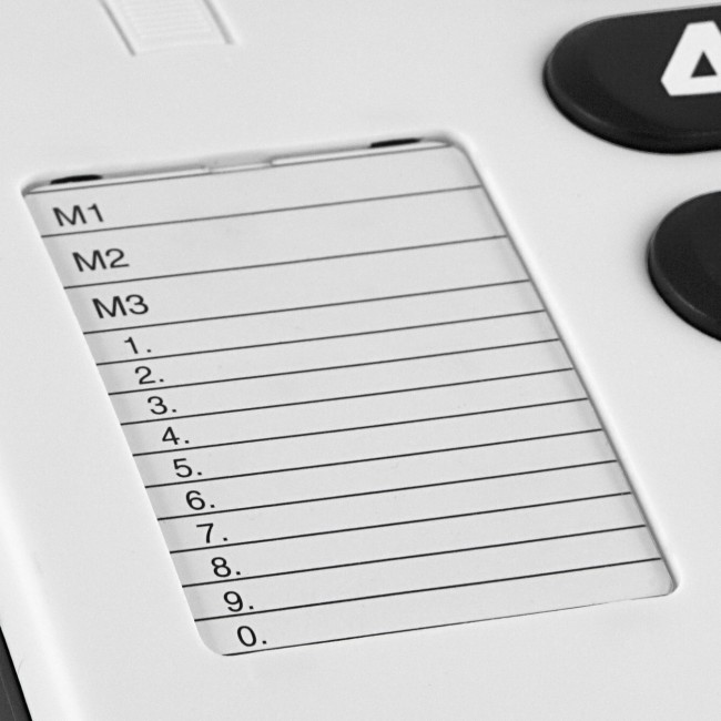 " Corded phone with large buttons including direct dial and speed dial function, HAC (Hearing Aid Compatibility) and optical call signaling for incoming calls."